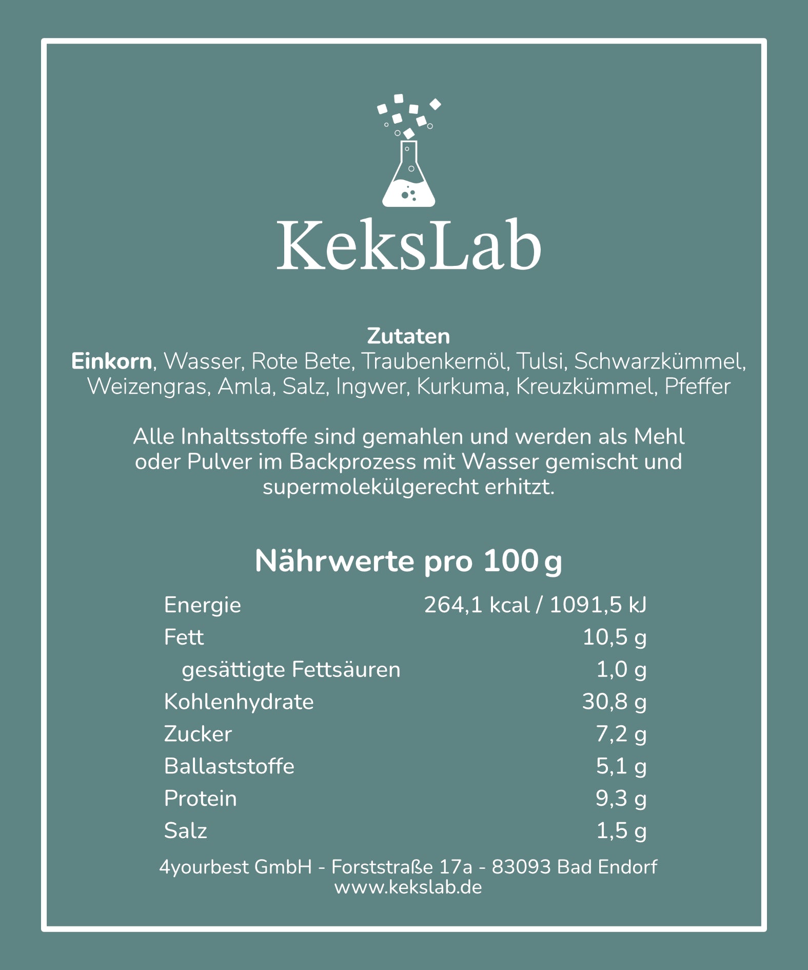 EINKORN, Wasser, Rote Bete, Tulsi, Traubenkernöl, Schwarzkümmel, Weizengras, Amla, Salz, Ingwer, Kurkuma, Kreuzkümmel, Pfeffer